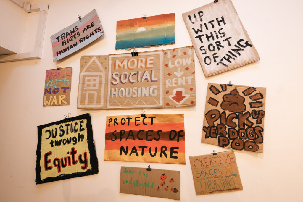 Creative Voices, Activist Voices: Sensory Stories of Creative Communities exhibition opened at The Albany CaffA on 21st August 2024. This event brought together guests, Fun Palace makers and participants who contributed to the research. The event used the objects from the exhibition to create the activities; food using recipes from the Nom Nom cookbook and bubble-making activities. There was also a banner-making workshop, the results of which were displayed as part of the exhibition.
